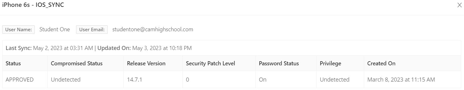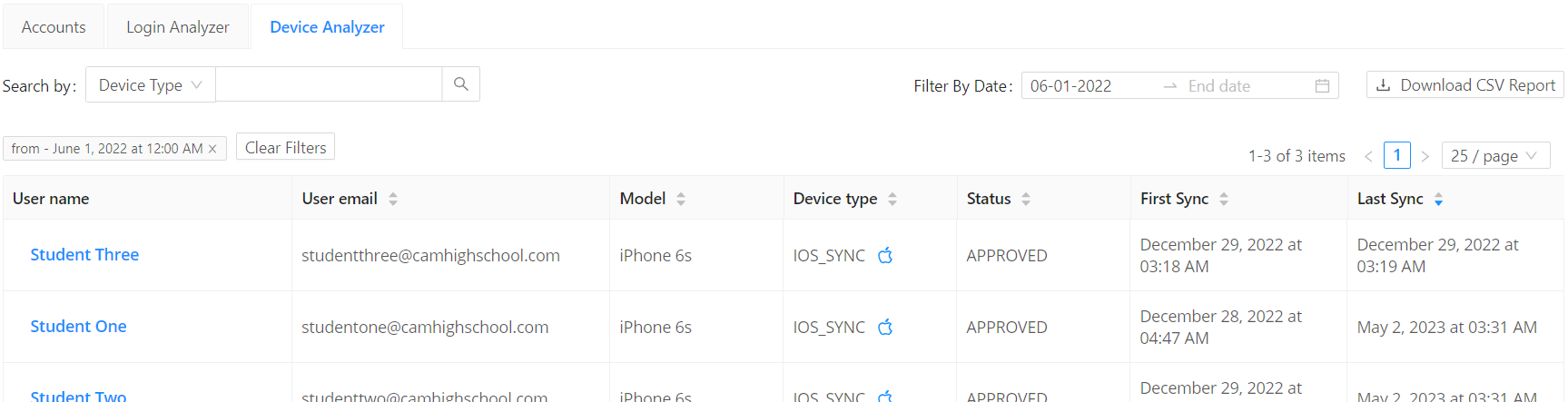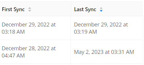 The first and last sync column in the results summary section sets the First time the device was accounted for on login. While the Last time gets set on most recent device event login.