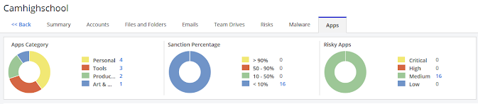 Sanction Percentage: The total number of apps in your environment, broken down into their sanctioned values. Sanctioned percentages are based across all Cloud Access Monitor Users.