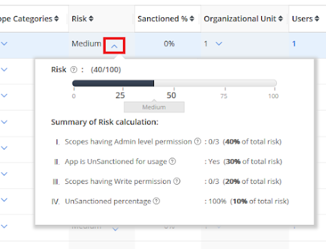 The risk column will display the theoretical risk to your environment. Risks are calculated on a scale based off of scopes that require admin privileges, If the app is sanctioned in your environment, if the app has write permission, and if the app is sanctioned in other Cloud Access Monitor Environments.