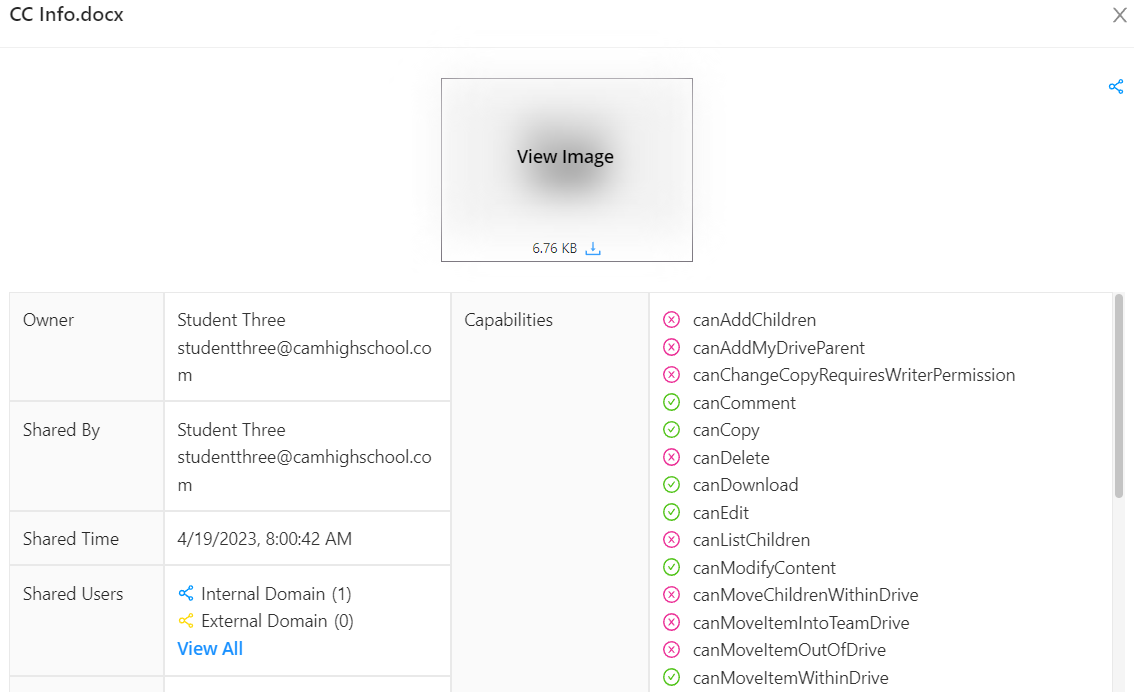Shared Via Link: If the file is set to be shared via link, and the permissions / share type of the file. Internal / External, Edit / View permissions.
