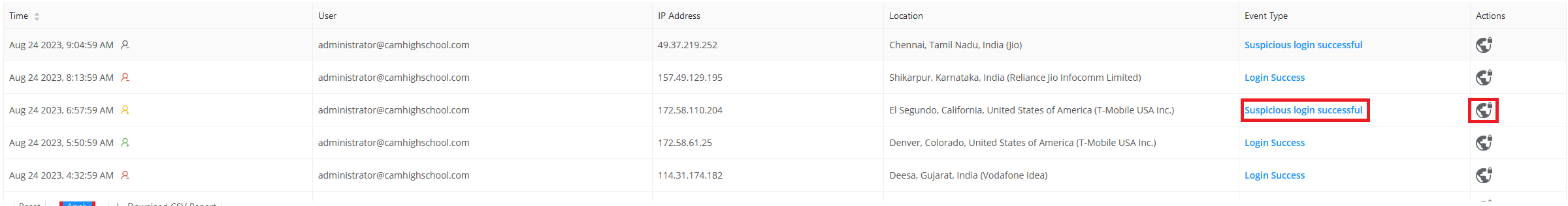 Look through the users login and find the suspicious login in question. Then select the Globe icon. This will open a new tab in your browser, VPNs will be shown as "Possible Proxys".