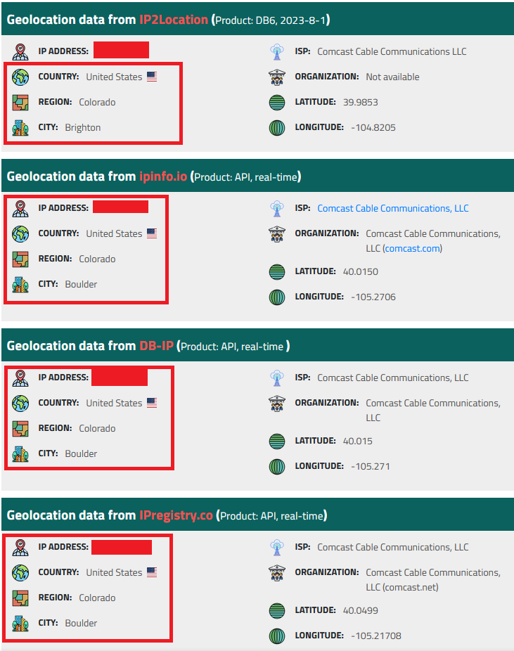 - We suggest using https://www.iplocation.net/ip-lookup to verify the location is consistent across multiple sites.