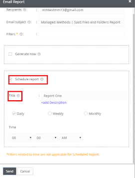 Schedule Report: Select the check box, enter a Title and then choose the schedule you would like to receive reports. Then select Send.