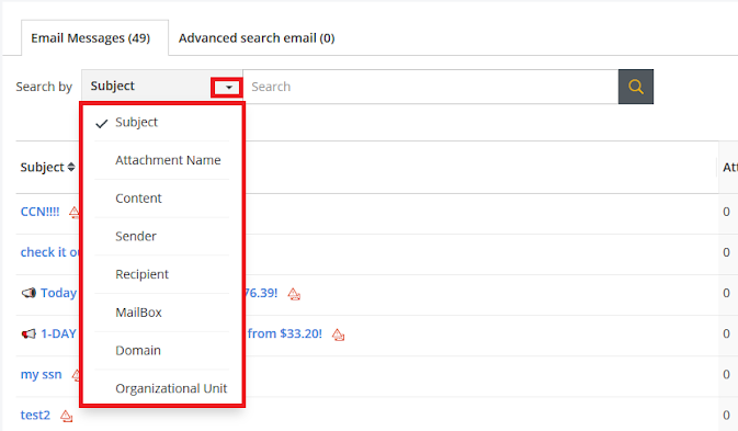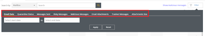Quarantine Status: Search either quarantined or unquarantined emails.