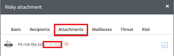A list of the attachments associated with the email, name and size are displayed, and the Download icon allows you to download the attachment for further investigation.