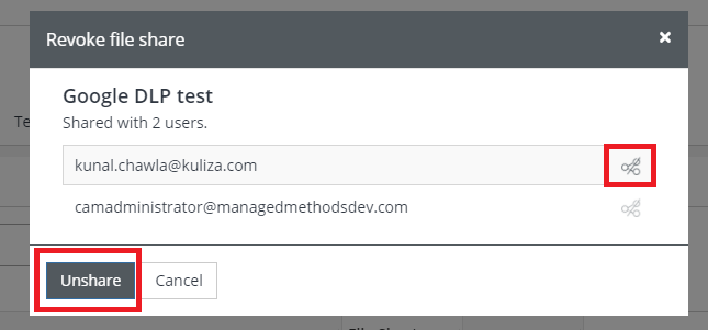 To remove sharing of a file click the Unshare icon in the Actions column.