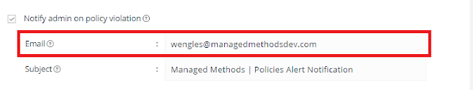 Define alternate admin contacts if desired. If the "Send email to" checkbox is left blank, policy violation emails will be sent to the email defined in step four at the top of the page. This can be one or a comma separated list of email addresses to be sent policy violation alerts of this policy only.