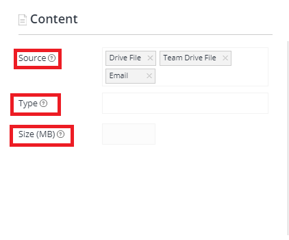 Here you can chose to narrow the source, type, and size of the content you wish to create a policy for.