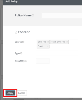 Source: Choose the sources you wish to create the policy for, Drive File, Shared Drive File, Email, or Hangout.