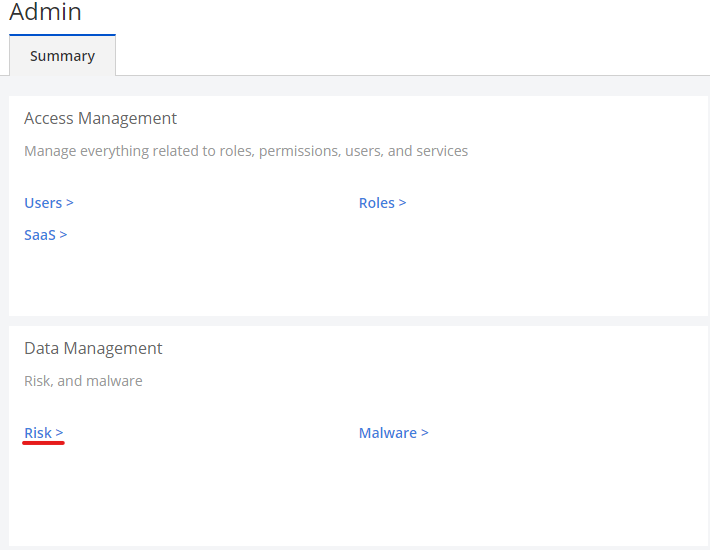 In the admin page, select the Risk link within the Data Management section.