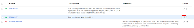 In the Risks Details, find the Profanity object, and select the edit icon found on the right side of the page.