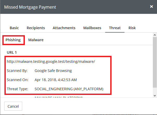 GOOGLE WEBRISK: Utilizing googles technology we are able to scan every link for known phishing threats. Links are scanned in emails, documents, and attachments. Any time a link is found to contain phishing content it will be flagged in the console in the Email Tab with the phishing link icon. Selecting the Icon will display the risk. The Url, Scanning Method, and Threat Type will be displayed. See our article on Removing Phishing Emails.