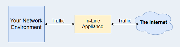 An in-line security solution is an appliance or gateway that your networking traffic is directly routed through. In-line appliances work as network filters that can block information in flight, stopping it from being transferred. In-line appliances and gateways typically have very involved setup processes, with configuration often being necessary on all devices used to connect to your environment.